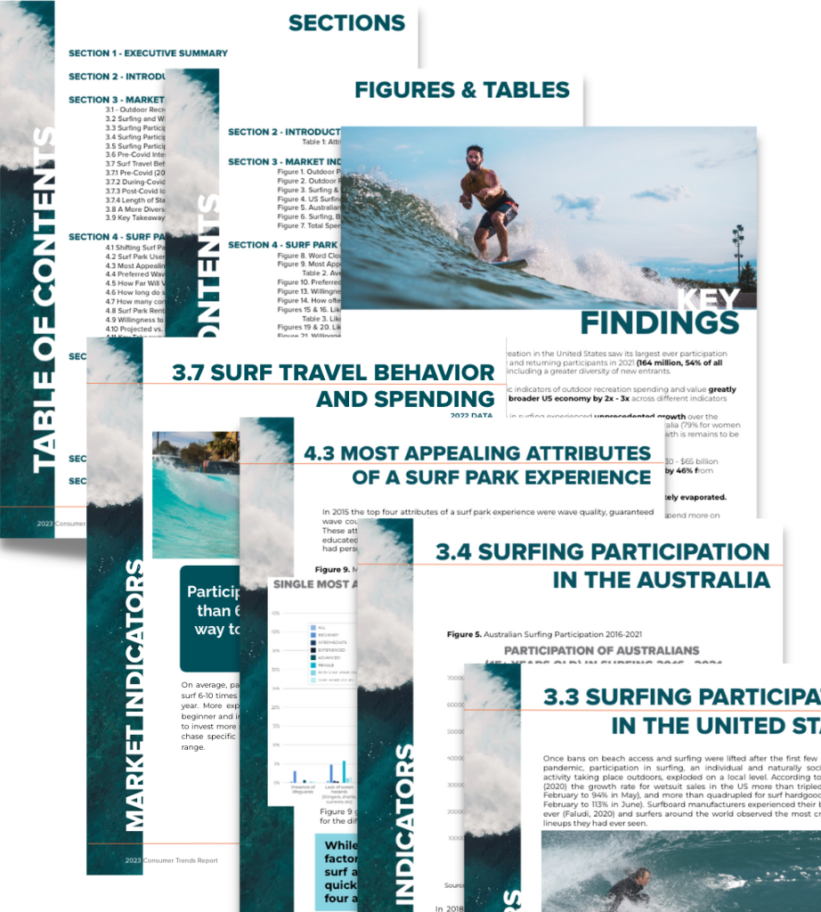 “The aim of this report is to aggregate the best information on the surf market and related market indicators and combine it with primary research conducted between 2015 and 2022 in order to provide valuable and actionable market intelligence and track consumer trends in the surf park space over time.”