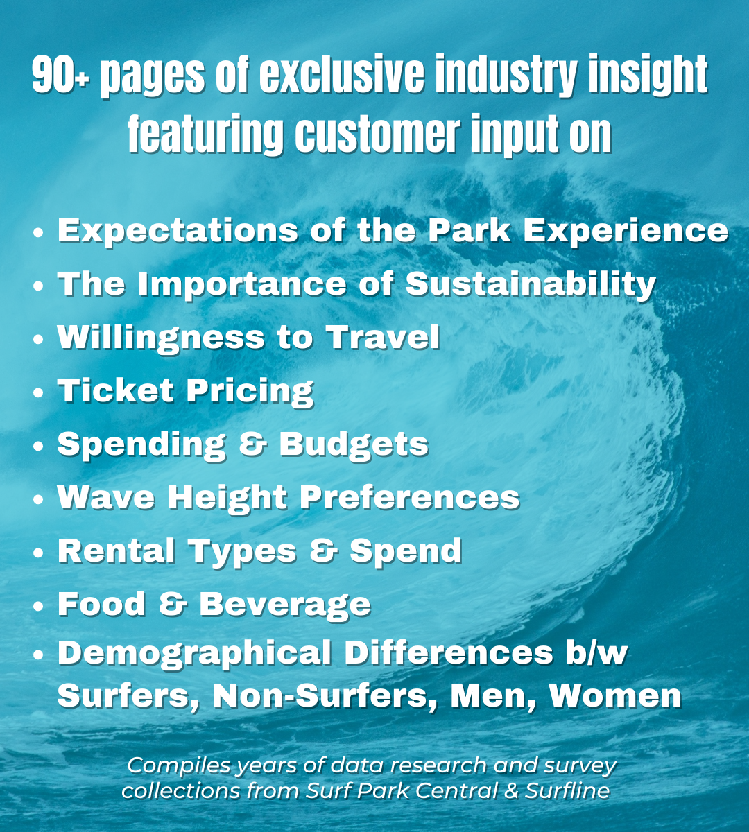 Featuring data gathered from thousands of surfers and surf park customers, the report takes a comprehensive look into into multiple demographic groupings form around the world and provides key information related to consumer trends, spending habits, travel incentives, surf session preferences, and so much more.