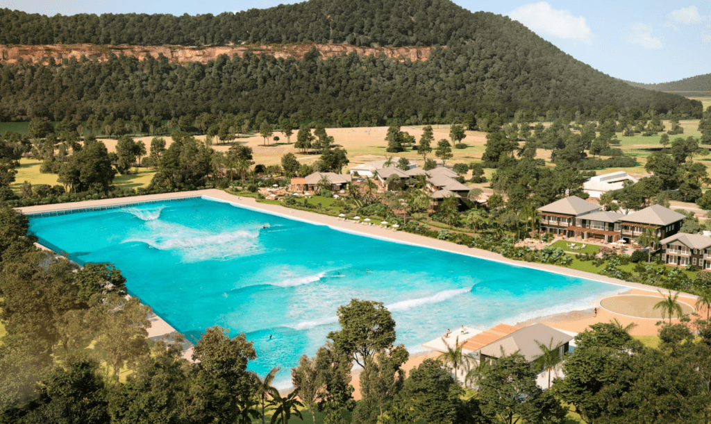 “Unlike other wave pools, that have the tendency to feel like they’ve been dropped in the middle of nowhere, Wisemans Surf Lodge is utilising structures that are already there (apart from building a pool the size of four football fields). A 45-acre hotel called “The Retreat as Wisemans” – that was built in the early 90s and previously owned by a Chinese hotel group who acquired it in 2016 for reportedly just shy of $10 million – is the site. The hotel’s getting a re-design by Sydney architect Kelvin Ho (think Merivale’s best spatial offerings), who’s been charged with revamping the resort, transforming the rooms into elegant pool-side suites, and the restaurant and clubhouse into modern spaces complete with bars, a gym, co-working spaces and everything else you’d expect from modern luxury hang-outs.”