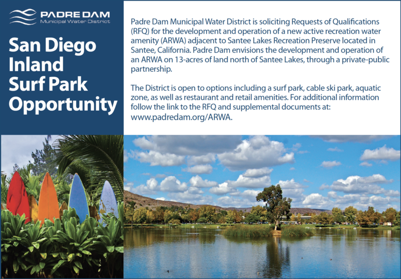 Business Surf Park Development Opportunity in Inland San Diego, CA Padre Dam Municipal Water District is soliciting Requests of Qualifications (RFQ) for the development and operation of a new active recreation water amenity (ARWA)... DevJanuary 1, 2019