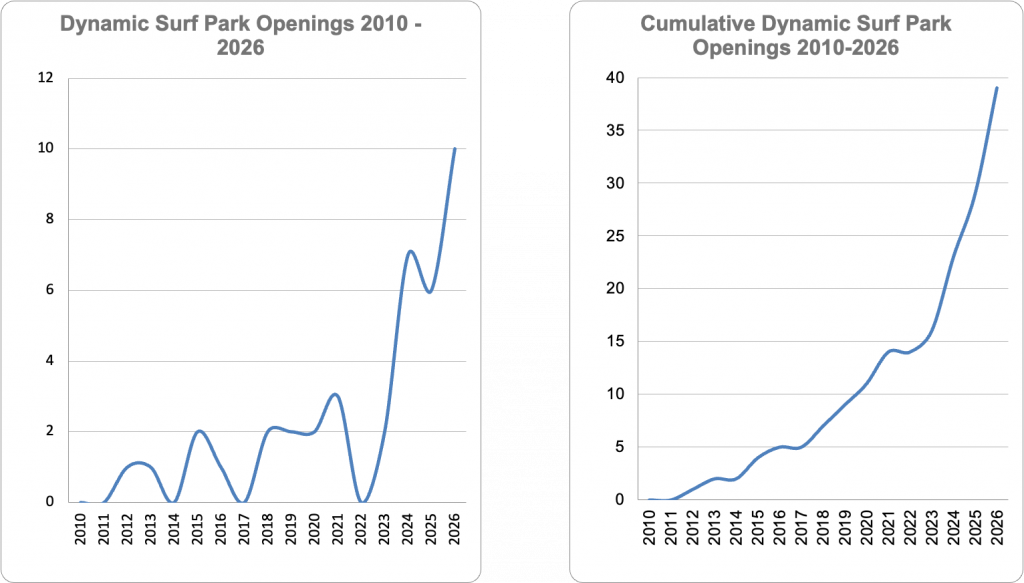 I’ve been saying that the industry is at a tipping point in my opening address at every Surf Park Summit for the last 13 years. When institutional capital finally came to the surf park party in Edinburgh in 2021, it seemed like we might be there, but the Covid pandemic caused a global slowdown that resulted in no new surf park openings in 2022, and the Lost Shore capital stack has not been emulated since. However, in 2023, surf park openings took off and continue to have a rocket-like trajectory. The graphs below show annual dynamic surf park openings per year and cumulative surf park openings from 2010 through to 2026.
