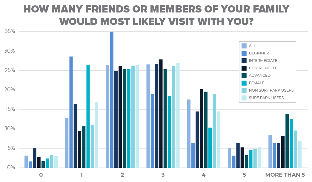 In our 2022 study, participants indicated that they would bring 2.9 friends and/or family with them to visit a surf park, but that only 2.4 of these companions would be taking lessons. Beginners are less likely to bring as many people, perhaps because they don’t have an established network of surfing peers to travel with.